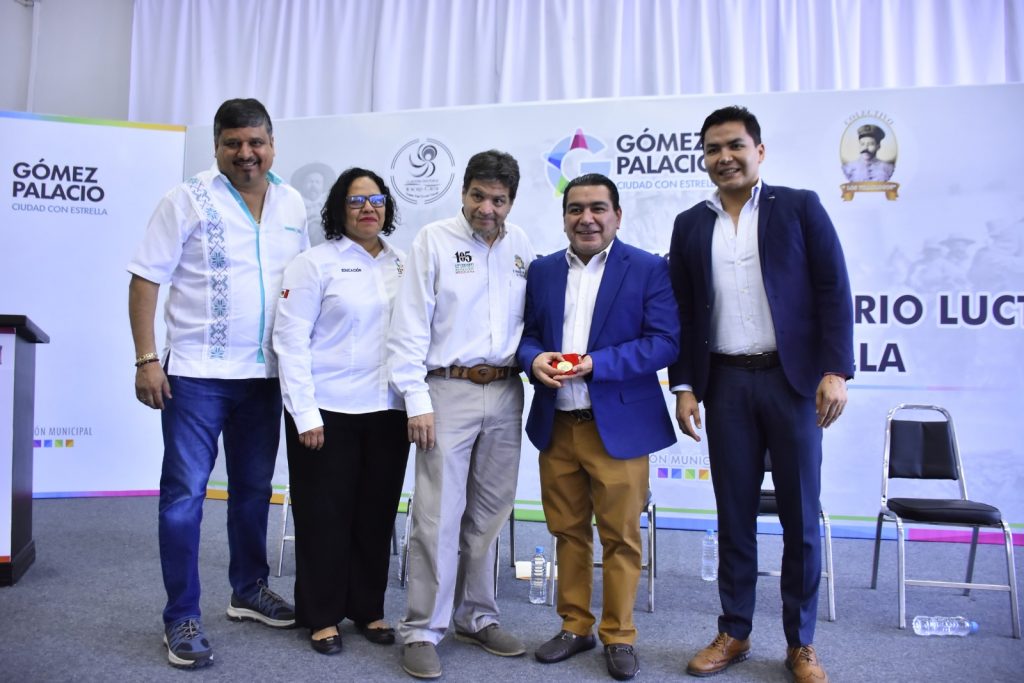Dentro de las actividades de la Jornada Histórica por el Centenario Luctuoso del General Francisco Villa, la presidenta municipal de Gómez Palacio, Leticia Herrera Ale, fue reconocida por su labor e interés que siempre ha brindado para preservar y dar realce a las fechas conmemorativas de México, por lo que Francisco Villa Betancourt, nieto del Centauro del Norte, le otorgó la medalla conmemorativa, la cual recibió en su representación el Secretario del Ayuntamiento, Vicente Reyes Solís.