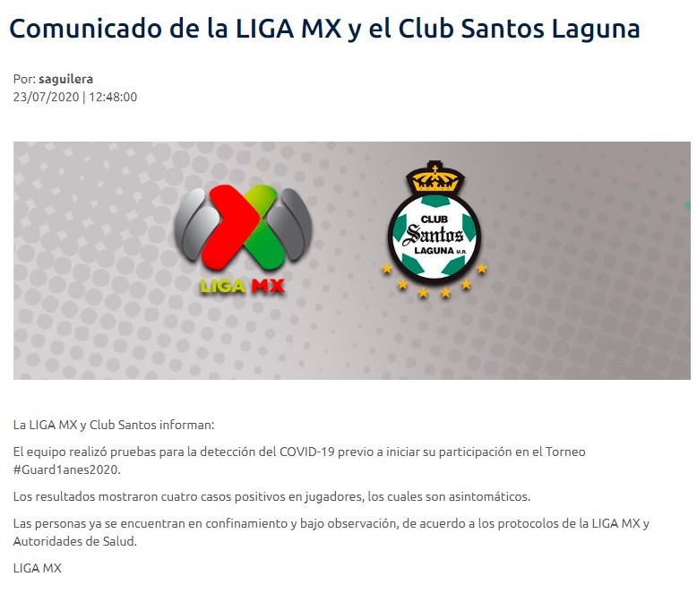 Hace unos cuantos minutos mediante un comunicado en redes sociales, la Liga MX, ha dado conocer que en el equipo de Santos Laguna se encontraron cuatro casos positivos de jugadores con COVID-19.