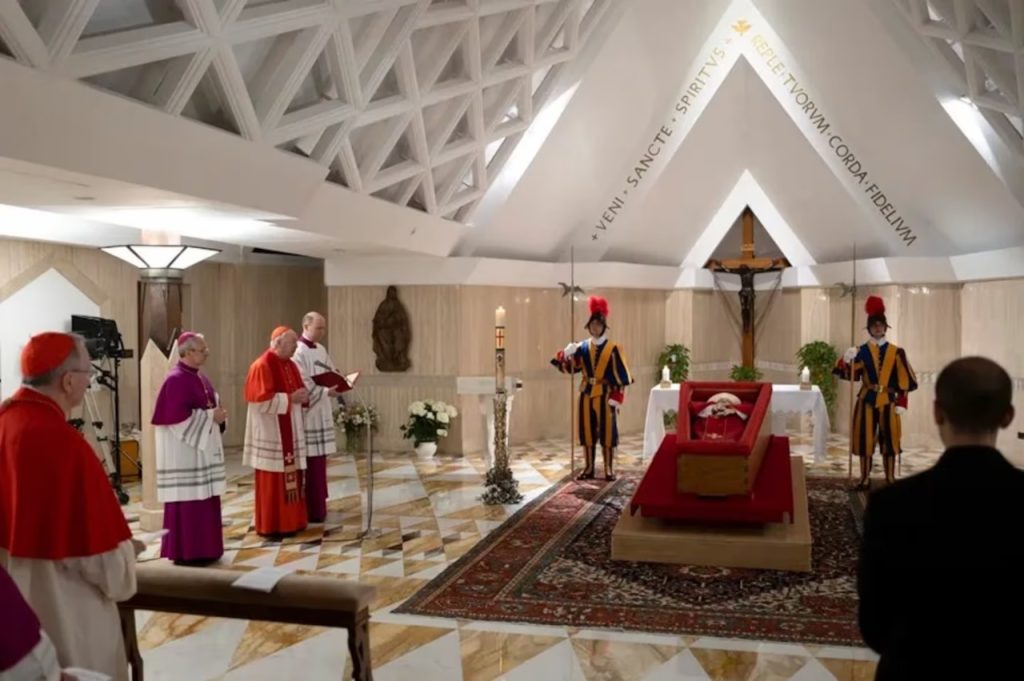 El Vaticano a través de sus redes sociales dio a conocer las primeras imágenes del cuerpo sin vida del Papa Francisco en el ataúd y vestido con una casulla roja que representa amor y la sangre derramada de Jesucristo.
