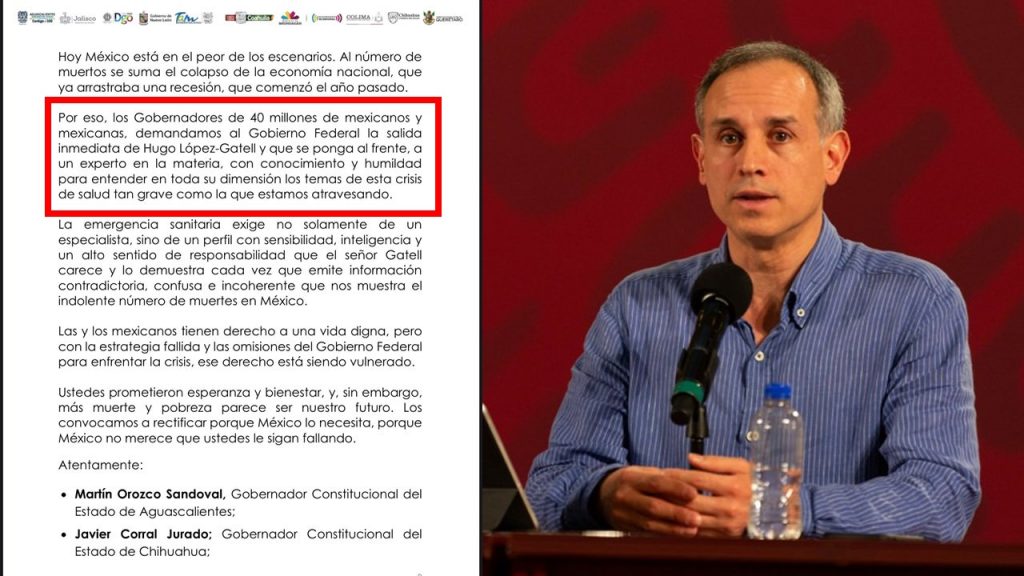 “Los gobernadores de 40 millones de mexicanos y mexicanas, demandamos al Gobierno Federal la salida inmediata de Hugo López-Gatell y que se ponga al frente, a un experto en la materia, con conocimiento y humildad para entender en toda su dimensión los temas de esta crisis de salud tan grave como la que estamos atravesando”, se expone en la carta.
